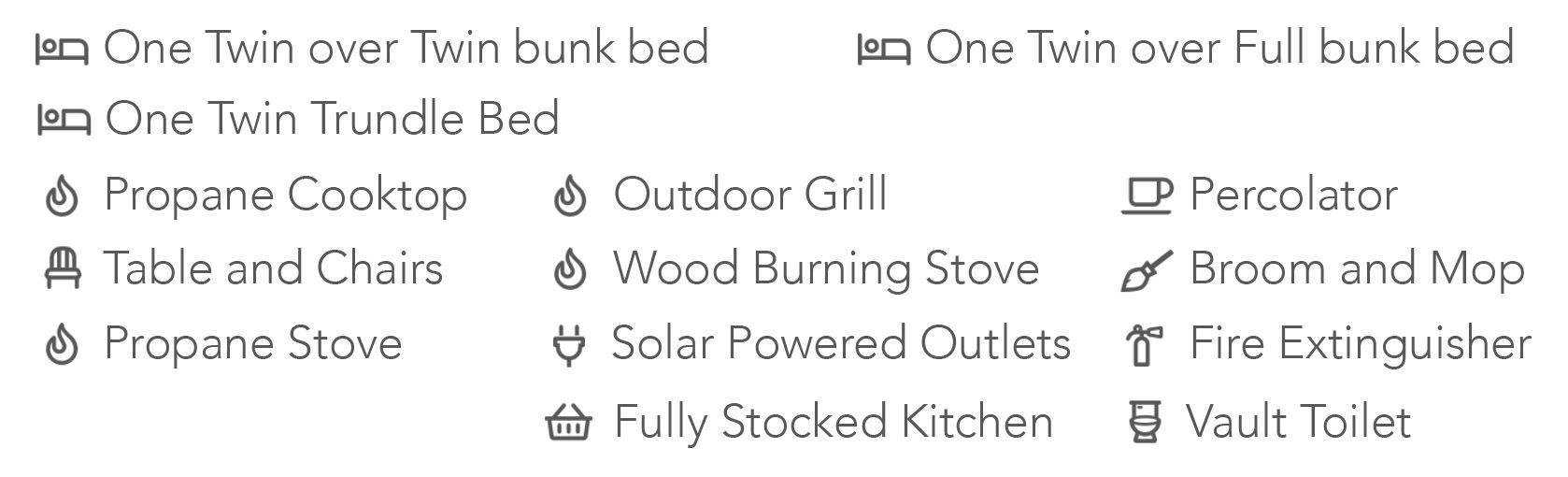 Agnes Creek is fully equipped with (1) twin over full bunk bed , (1) twin over twin bunk bed, and (1) twin trundle bed. The kitchen is fully stocked with pots, pans, dishes, utensils, percolator, propane cooktop, wood stove and a solar system for lighting. Outside you will find the vault toilet room, stacked wood, and outdoor grill that can be used with the supply of your own charcoal.